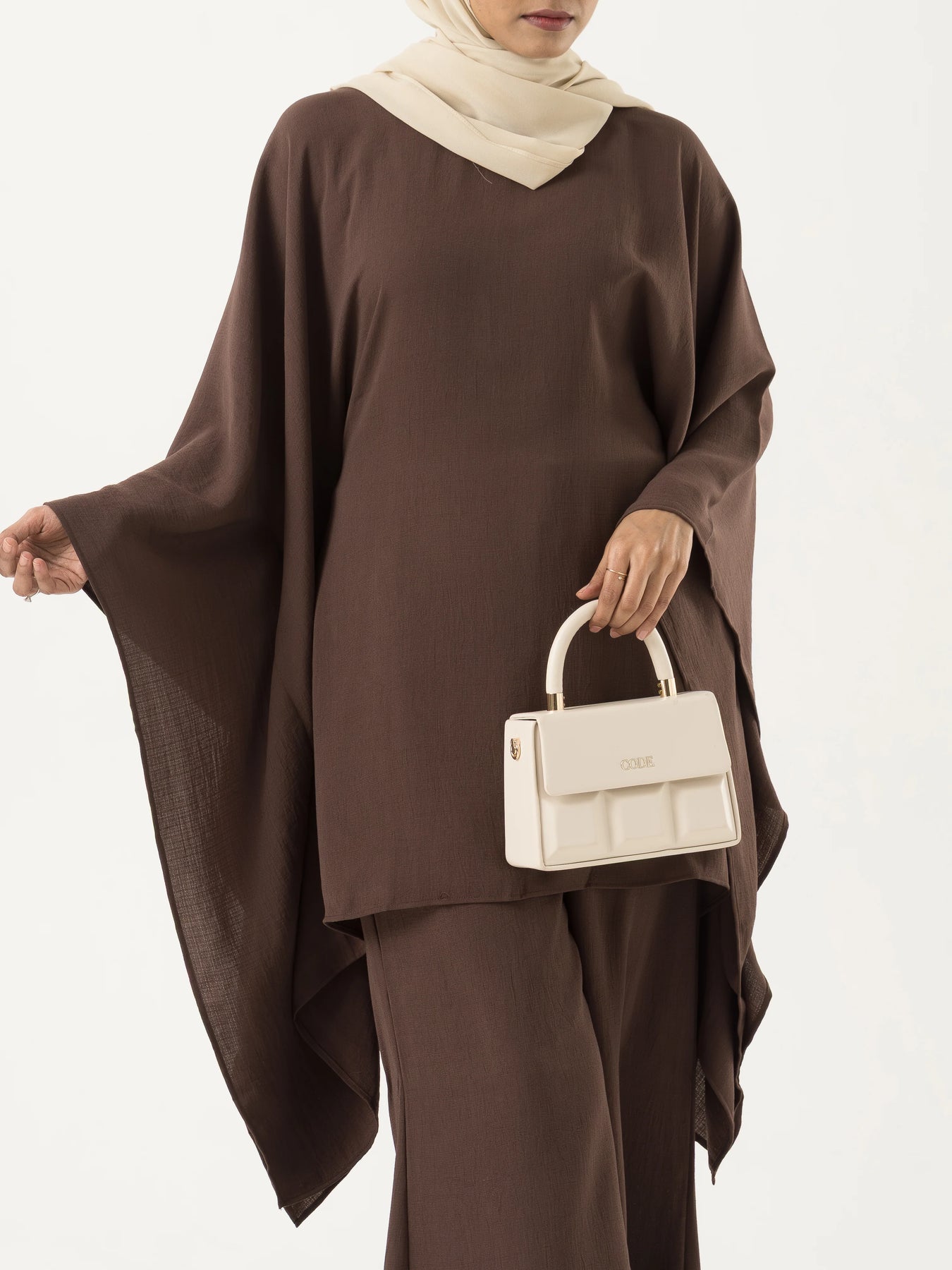 Cet ensemble modeste se distingue par son haut fluide façon cape,
