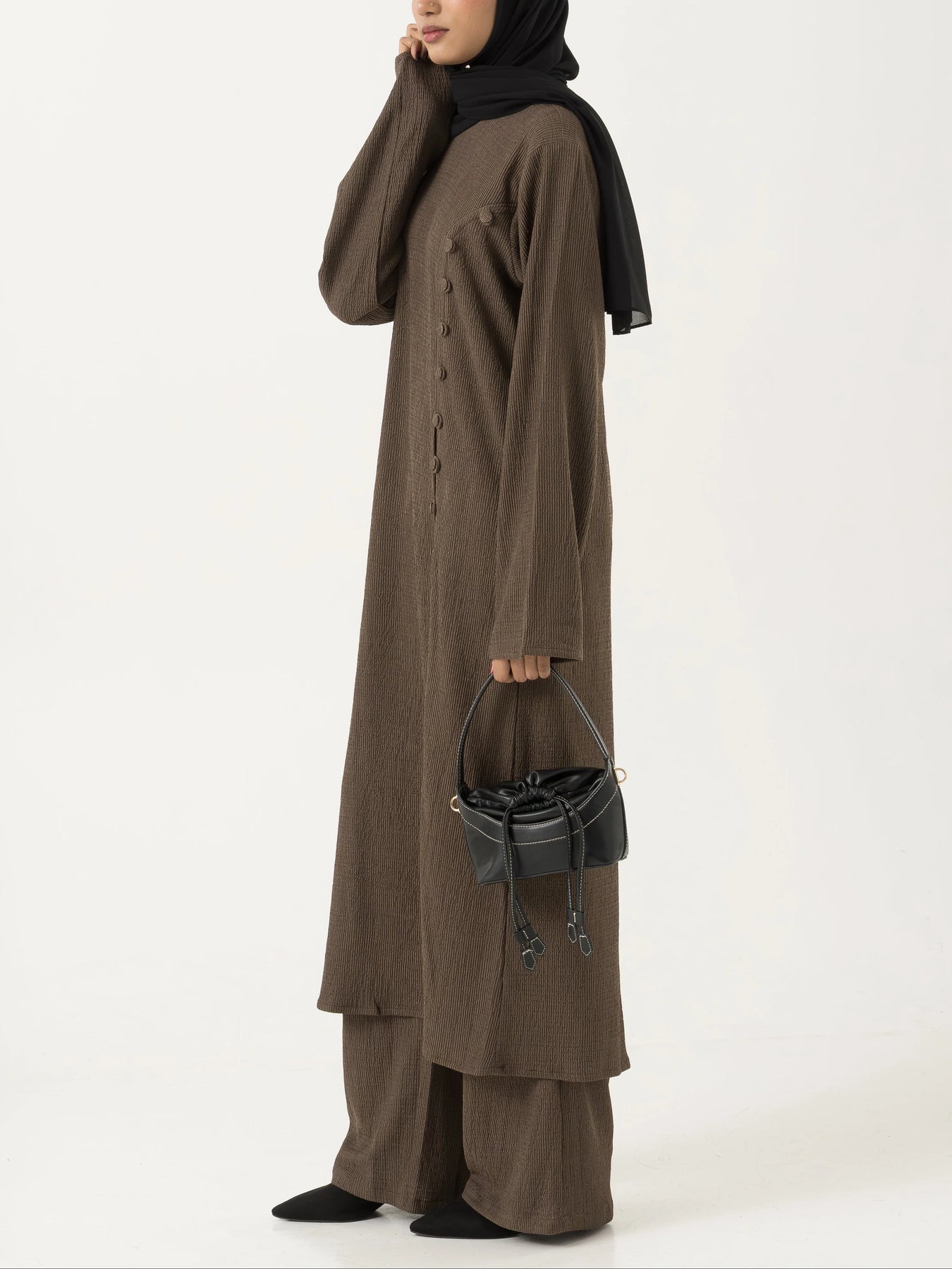 Cette robe modeste se distingue par son tissu texturé élégant et sa coupe fluide.